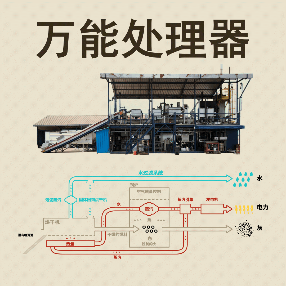 为了解决这一问题,我们和合作伙伴一起开发了一个小型处理厂,能够处理从坑厕、化粪池和下水管道中收集的粪便和有机污泥。我们把它叫做万能处理器,它不仅能产生足够的电力支持自身运转,还可以放置到任何一个地方。它不仅能将人类粪便中的有害病原体杀死,还能将剩下的物质转化成有经济价值的产品,包括清洁的水、电力和肥料。